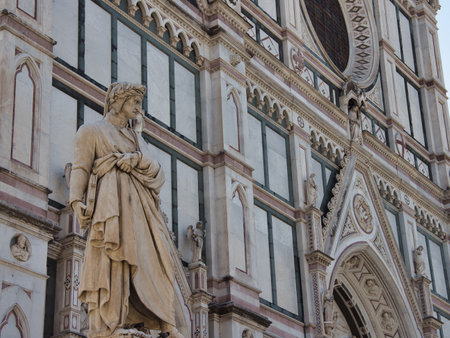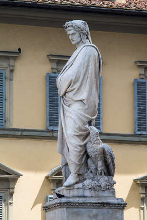 FLORENCE, ITALY - JULY 25, 2017: statue of Dante Alighieri in the square of the Basilica of Santa Croce - Tuscany