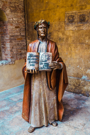 Verona, Italy - September 22, 2021: Bronze statue of Dante Alighieri, author of the Divine Comedy.