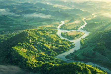 A tranquil river flows through verdant mountains, enveloped in morning mist. The serene landscape captures the essence of nature's beauty and calmness at dawn.