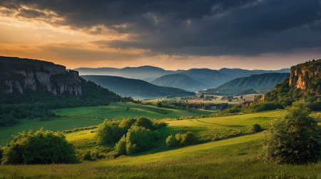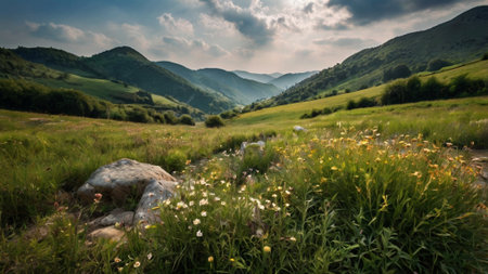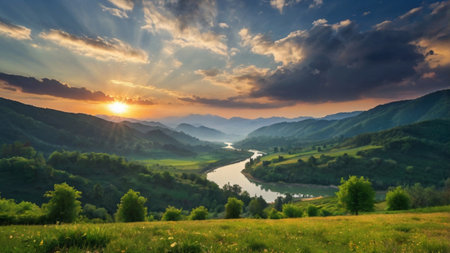 Verdant hills stretch across the horizon, their slopes adorned with autumn foliage in vibrant shades. a river cuts through the lush valley, while a dramatic overcast sky adds depth and contrast to the serene scene. Generative AI