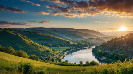 Cows graze leisurely in a verdant valley, with a serene river flowing through the landscape under the warm glow of the setting sun.