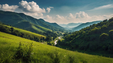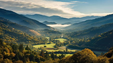 Picturesque Mountain Valley Landscape with Lush Green Forests Under a Partly Cloudy Sky