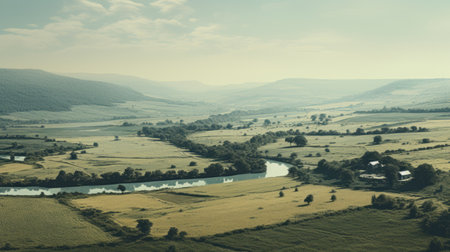 the countryside landscape from above showcases a stunning flat, duotone color scheme. the aerial view captures the serene beauty of the rural area with its harmonious blend of colors. this image is a perfect depiction of the peaceful and picturesque countryside setting. ai generated