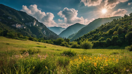 Beautiful mountain valley in summer sunlight at sunset, nature landscape background.
