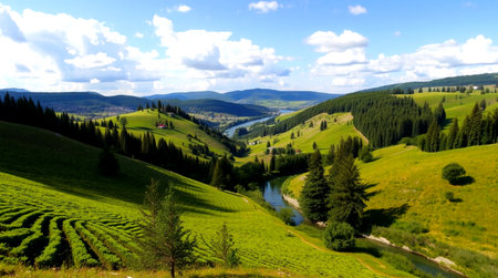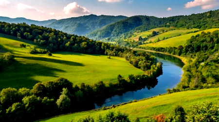 A serene landscape featuring lush hills and a winding river under a bright sky.