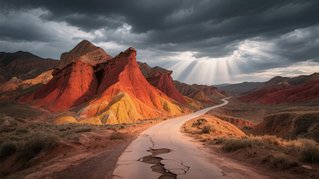 brick road with beautiful hilly landscape at dusk in zhangye danxia national geological park, gansu province, China.