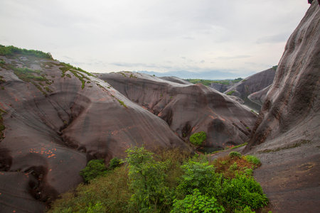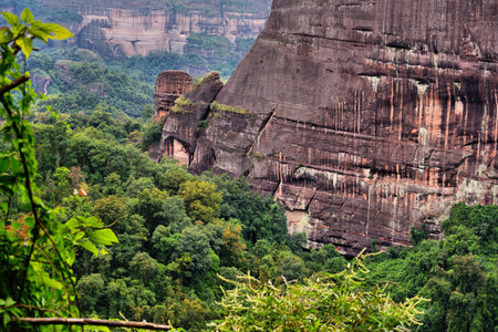 Rock formations in Danxia Mountains (Danxiashan) in Renhua County in Shaoguan (Guangdong Province) in China. AAAAA rated tourist attraction.