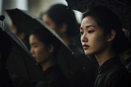 Young beautiful asian woman in black kimono with umbrella in the rain