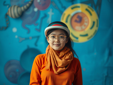 Young Asian woman with a candid expression and natural emotions, standing in front of a blue background, looking directly at the camera
