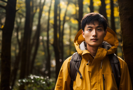 Portrait of young handsome asian man in yellow winter jacket outdoor