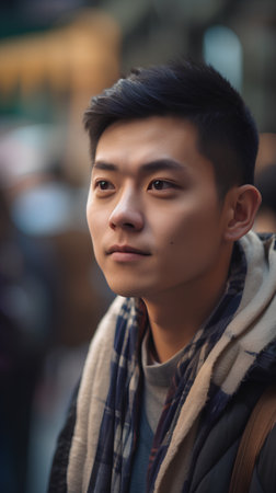 Portrait of a handsome young Asian man wearing glasses and looking away
