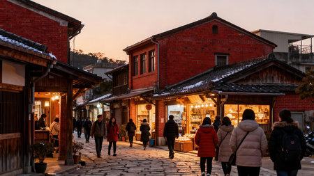 Sanxia, Taiwan - FEB 06, 2022: Sanxia Old Street is the facades of the buildings on the street were built in the baroque style. The buildings were built uniformly in red brick.