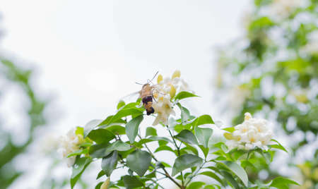 Orange Jessamine in the garden with hummingbird hawk moth searching for nectar.