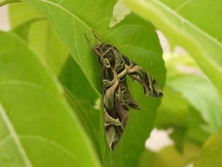 Close up of Oleander Hawk-moth or army green moth Daphnis nerii on marigold flower, dorsal view