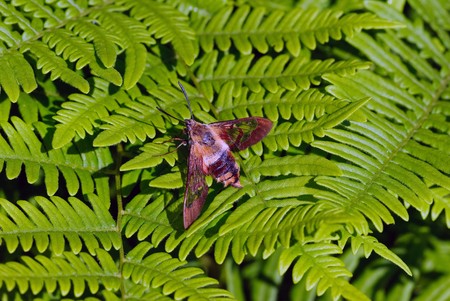 close up beautiful hummingbird hawk-moth resting on green leaf