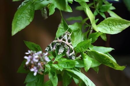Closeup on a large colorful pink Elephant Hawk-moth, Deilephila elpenor sitting in a shrub