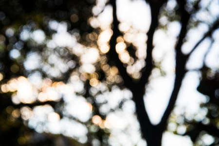 Abstract sunset natural bokeh shape highlights. Defocused forest scene, no people.