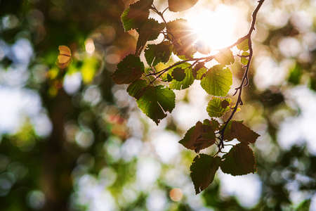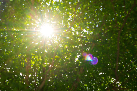 Blurred branches of a tree in the rays of the sun. Summer beautiful background