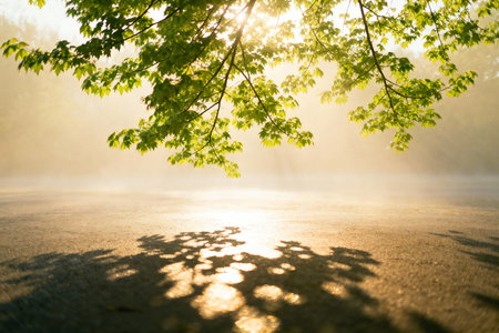 Sunlight filtering through trees creates a serene atmosphere with beams of light