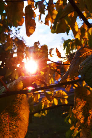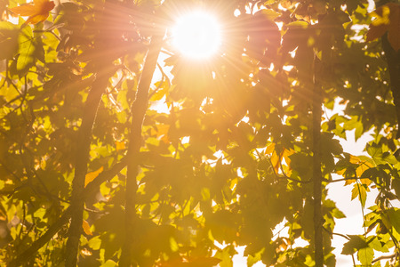 Sun shining between the autumn leaves, stunning background of the sunlight