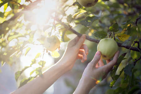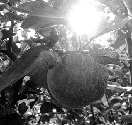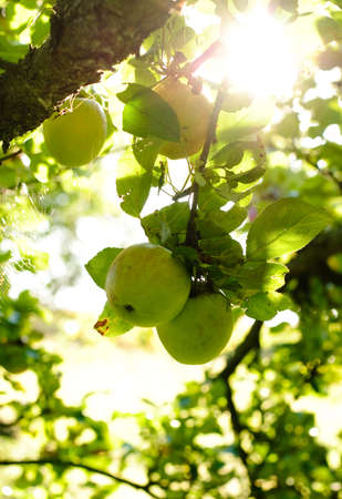 Beautiful apple orchard, the branches with fruit against the sun, vibrant toned, selective focus