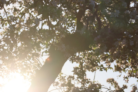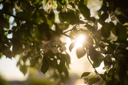 Branches of a blooming apple tree in the rays of the setting sun on a spring evening. The season of fruit trees and flowering bushes