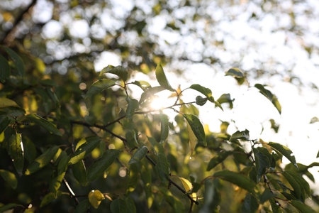 Sunlight shining through tree branches with green foliage in spring - lens flare and bokeh effect in natural backlight composition