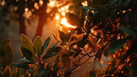 Golden red sunset light filters through the leaves, still atmosphere, warm orange glow blending with natural green
