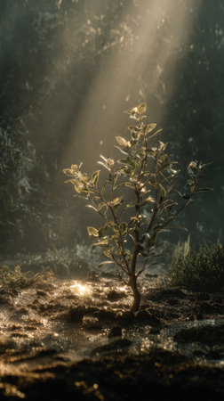 A cinematic wide shot of a young Wild plum growing, slightly larger than before, its trunk and branches beginning to take shape, surrounded by rich, dark soil and faint morning mist, golden sunlight breaking through the clouds, soft beams illuminating the growing tree, ultra-realistic photography with true Earth like realism natural hues, no artificial colors, cinematic composition, deep 3D parallax depth creating an immersive, awe inspiring atmosphere, subtle natural lens flares, minimal 35mm film grain, tranquil and hopeful tone, 8K, highly detailed.
