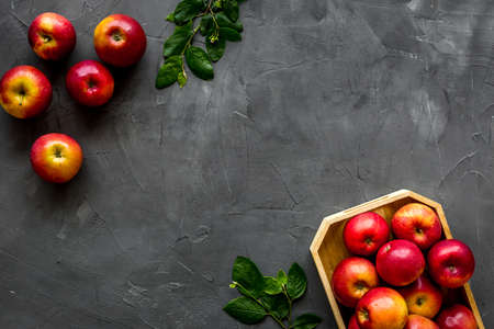 Ripe red apples with leaves - top view, copy space
