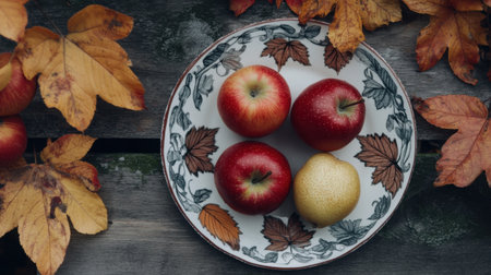A picturesque arrangement featuring assorted apples on a beautifully decorated plate, surrounded by vibrant autumn leaves on a rustic wooden surface.