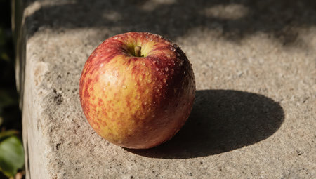 A close-up shot of a fresh, ripe apple with vibrant red and yellow skin, casting a shadow on a textured stone surface under bright sunlight.
