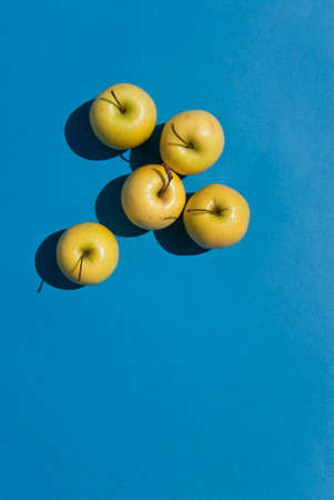 Fresh Yellow Apples on light blue background.
