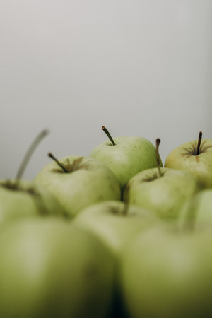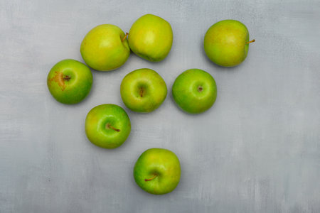 Still life photo of fresh green ripe apples on a grey rustic table. Still life food photography for many purposes