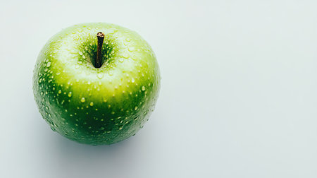 A vibrant green apple glistening with water droplets against a pale background. Perfect for health-related themes, food photography, and nutrition.
