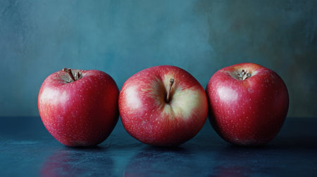 Three red apples lined up on a blue surface.