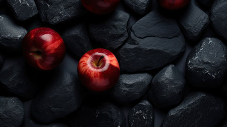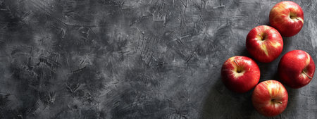 A top view of fresh red apples arranged on a textured dark surface, highlighting vibrant colors and natural textures.