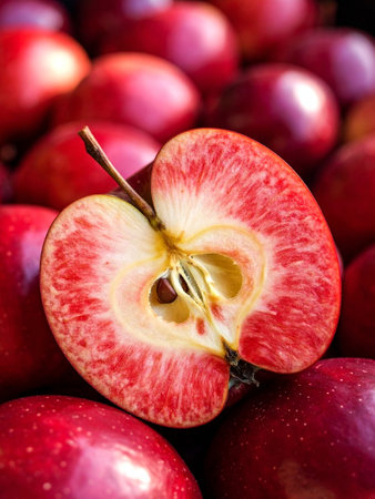 Fresh red apples with one apple cut in half, showing juicy flesh and seeds. A modern rich variety in anthocyanins, antioxidants and vitamins. Superfood.