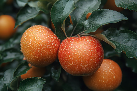 Close-up of ripe, dewy apples hanging on a tree branch, surrounded by lush green leaves. the scene highlights the freshness and vibrancy of the orchard during harvest season, ideal for seasonal marketing. Generative AI