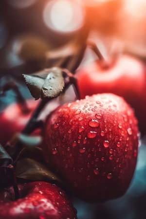 A vibrant red apple with water droplets glistening on its surface, showcasing fresh and healthy fruit. Ideal for promoting nutrition and organic food.