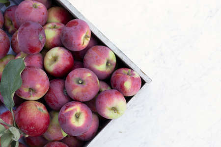 Red apples harvest in box on wooden on white background. Top view