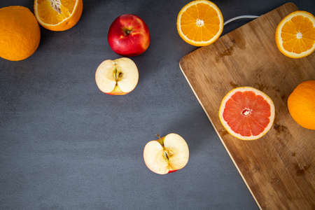 Oranges, apples cut in half on a wooden board on a gray background. Top view, flat lay.