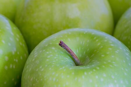 A close up showing the detail of fresh and organic, green, waxed apples that are shiny with the stalk showing and copy space