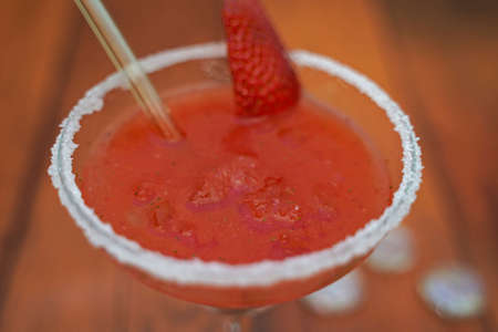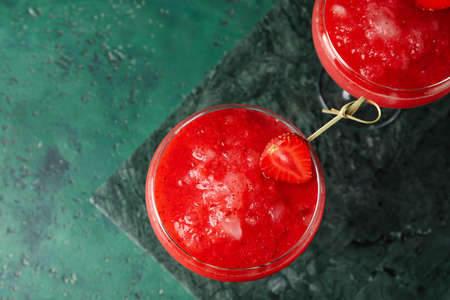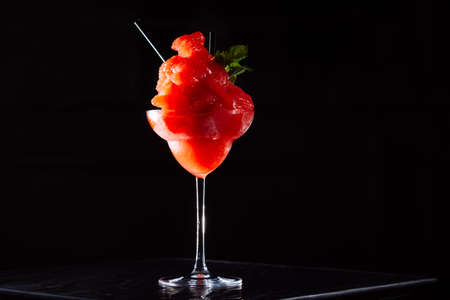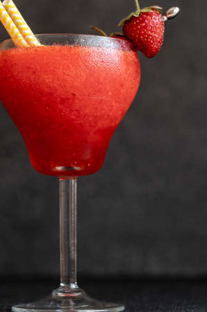 Frozen strawberry margarita on the dark background. Luxury craft drink concept. Horizontal