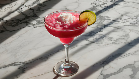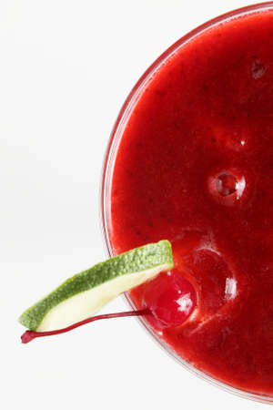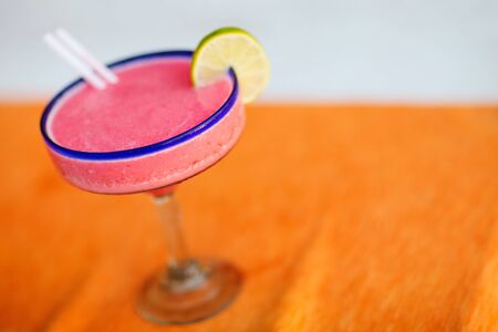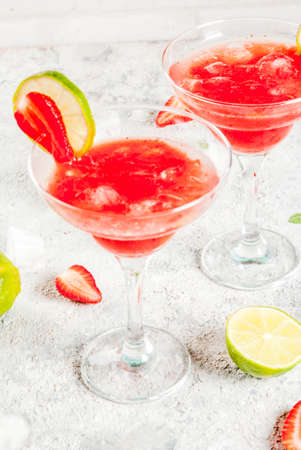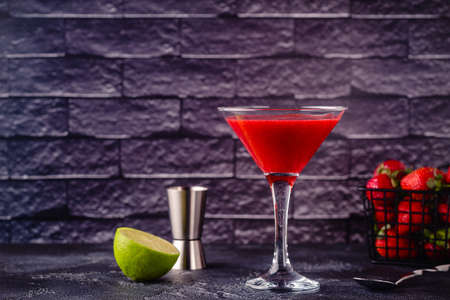 Cold strawberry margarita or daiquiri cocktail with lime and rum