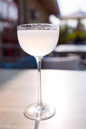 Cocktail glass features a refreshing white margarita beverage with a salted rim, set on a table in a lively outdoor atmosphere, ideal for social events and celebrations