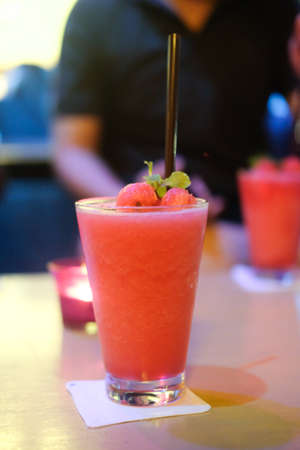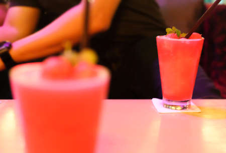 Fresh watermelon smoothie frappe in night pub, drink for lady (selective focus)