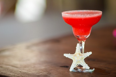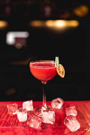 Traditional cocktail daiquiri, image for the menu. The cocktail stands on the background of the bar counter. Space for text