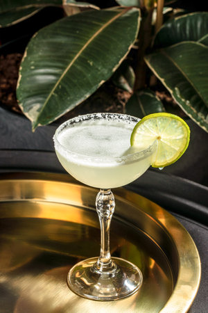 Refreshing margarita cocktail with lime garnish and salted rim served in an elegant glass on a golden tray.