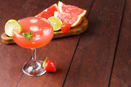 Classic daiquiri cocktail in glass on wooden table. Copy space
